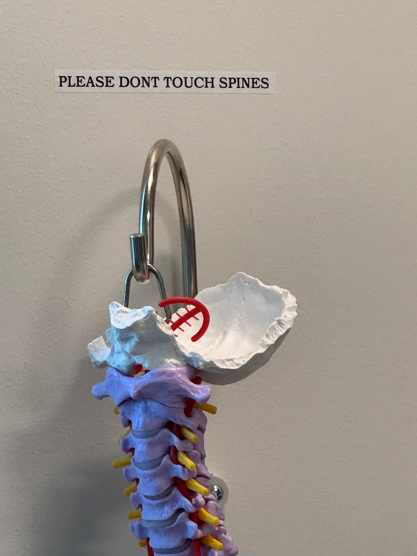 When she left me alone in the exam room, I felt a little discombobulated myself. To my left, at eye level, a multicolored, anatomical model hung on the wall with a label above it that said, “PLEASE DON’T TOUCH SPINES.” That sounded like great advice.